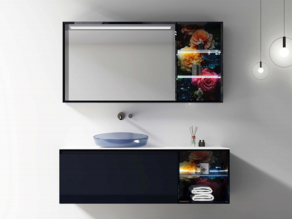 - 智能鏡柜功能:柜體藏藍免漆板,背板 PU 二分光藏藍油漆